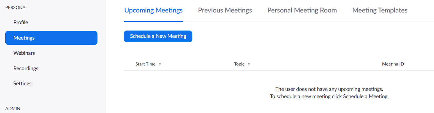 When logged into Zoom, click the Meetings heading on the left of the page: