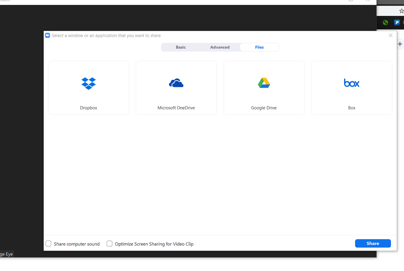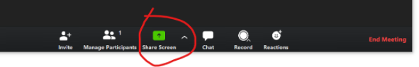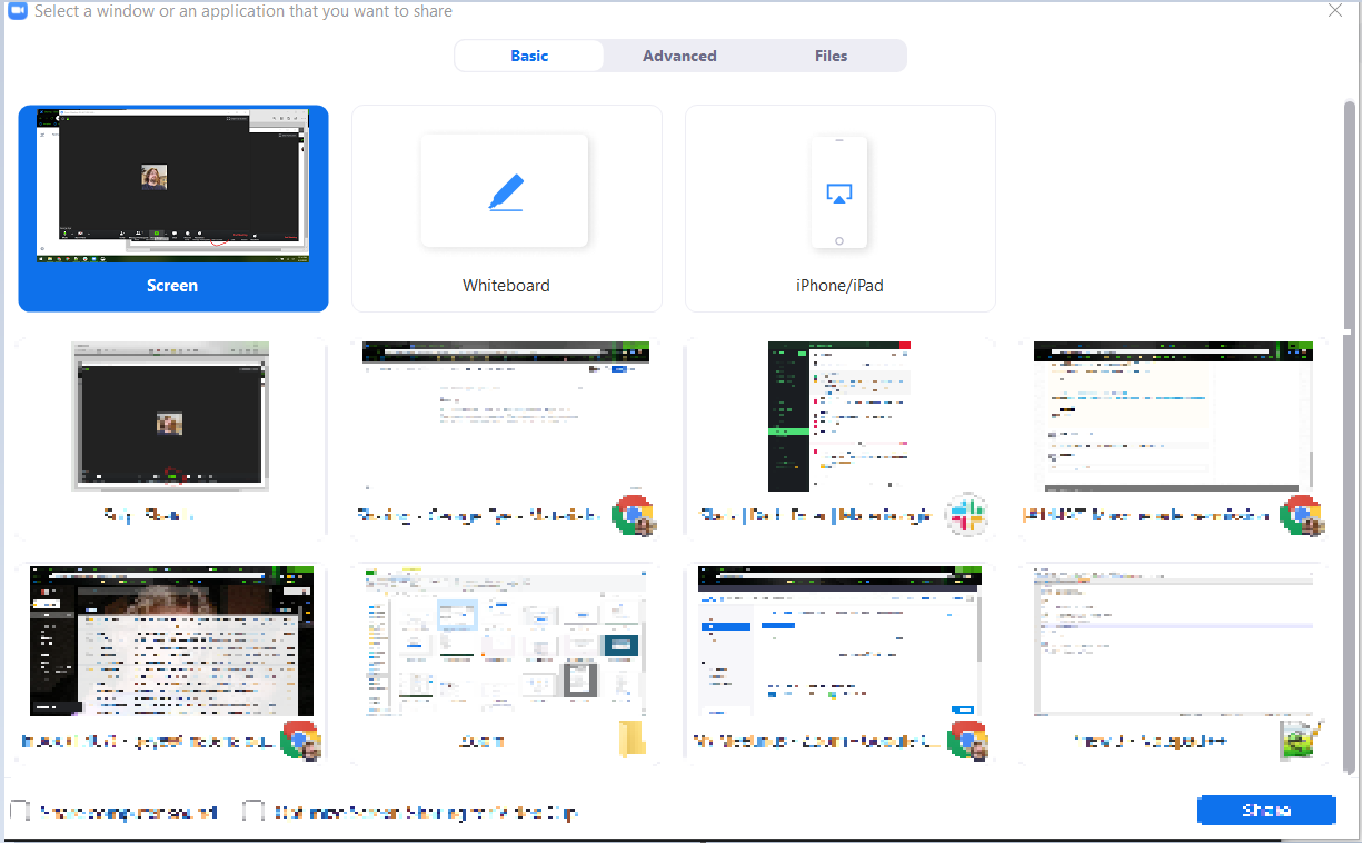 The basic screen sharing that can be done is the normal “Share Screen”, which display’s the presenter’s entire display, (for example, if you have a second monitor, this type shares both screens). Zoom can also share a specific application window, a user selected portion of the screen. To access the Sharing settings click the Share button at the bottom of the Zoom window: