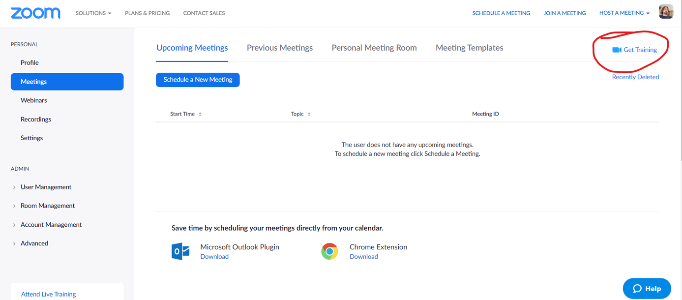 The Meetings section lets you view scheduled and previous meetings, and even access deleted meetings.